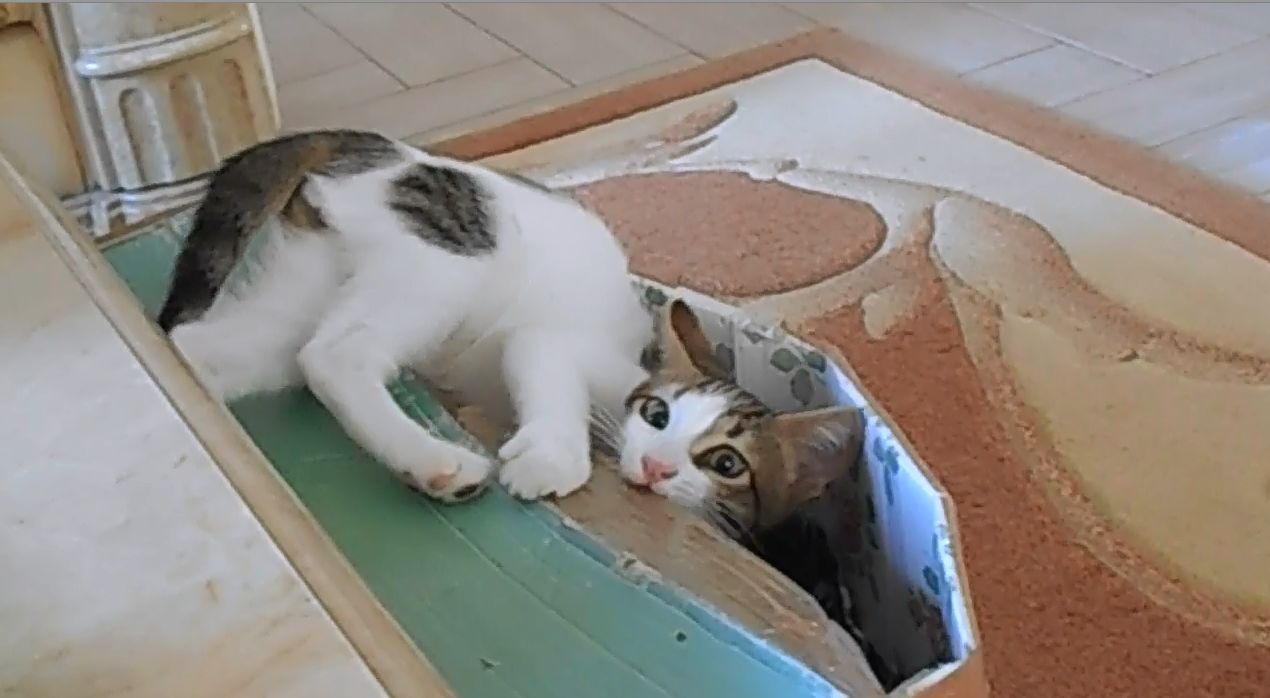 Шустрый ребенок в игрушки превращает все. И вообще, он существует в двух ипостасях - он либо играет, либо спит. В любой момент времени его бодрствования можно определить его местоположение. Он шуршит, гремит, скребет, муркает, шлепает подушечками по полу и тормозит с разбегу. Буська по мере сил и возможностей принимает участие в его буйных забавах. Он очень самостоятельный и целеустремленный. Если Пифагор задумал проказу, отвлечь его от этой проказы можно только предложив взамен другую. Самый маленький по росту и возрасту член нашей семьи заполняет собой все пространство дома. Он непосредственный участник всех событий происходящих в доме, а зачастую, их главный инициатор.